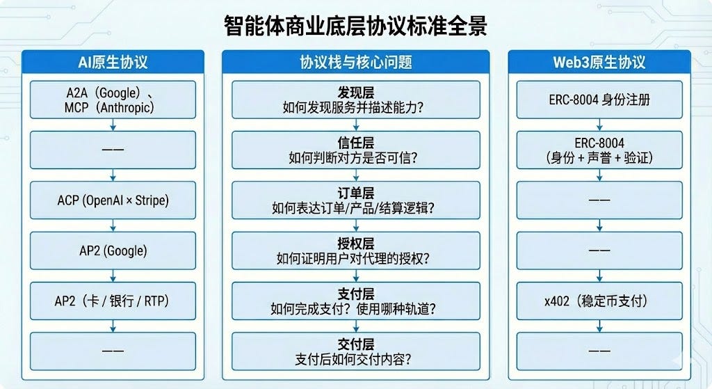 当下智能体商业(Agentic Commerce)的 Web3 生态可分为三层: