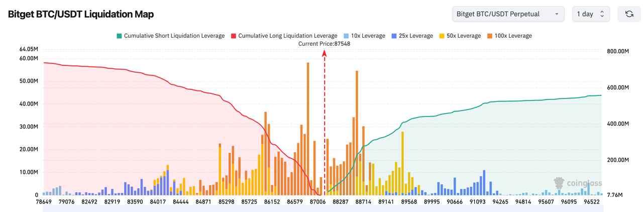 3、Bitget BTC/USDT清算地图显示:当前BTC约 87,548 美元下方聚集了大量 多头清算(红色),说明若跌破 87k 一线,可能触发连续多头止损,加剧下行波动。上方 88k–92k 区间 空头清算(绿色)逐步累积,一旦向上突破,容易形成空头挤压,推动价格快速拉升。