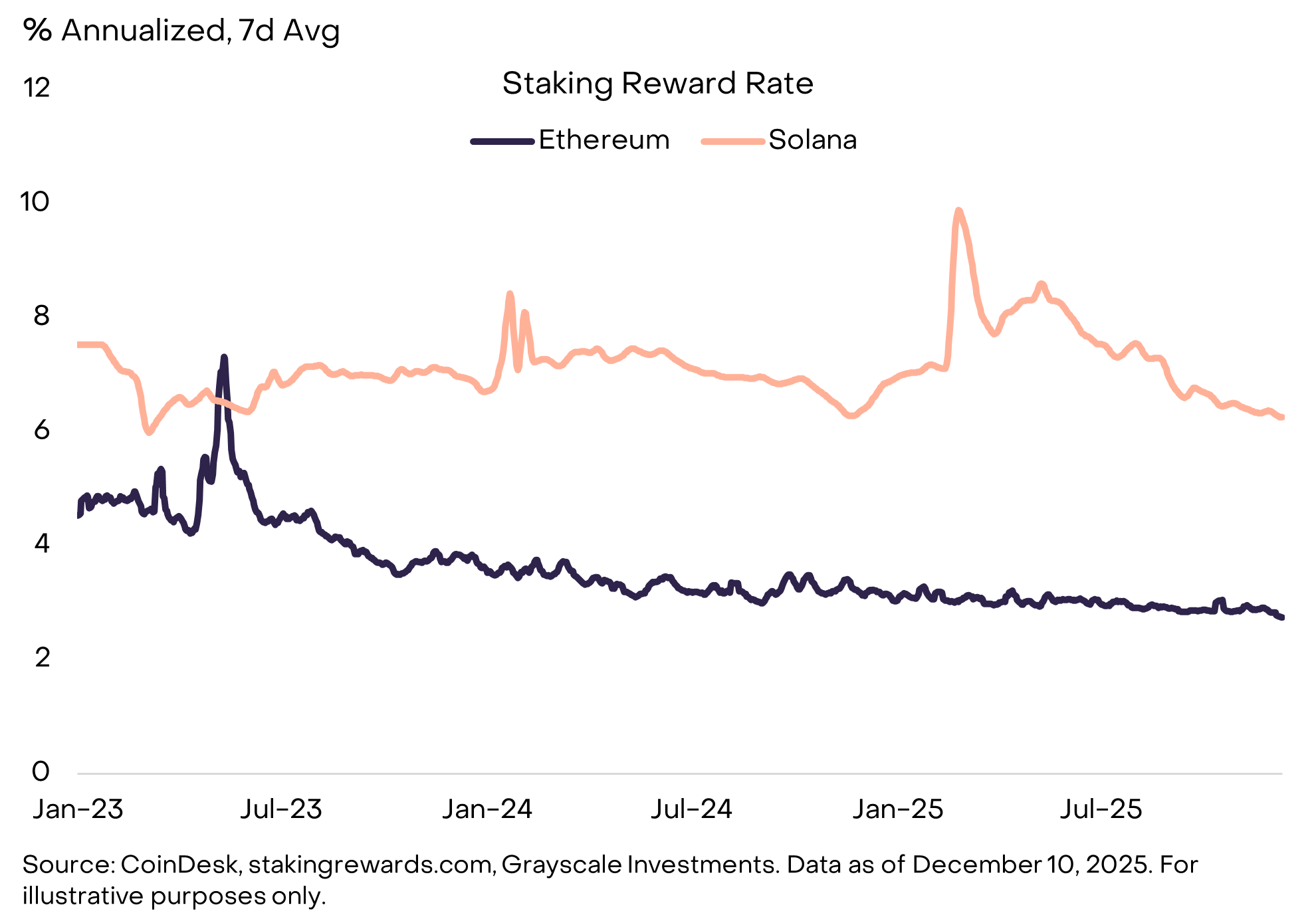 2025年,美国政策制定者在质押领域做出了两项调整,这将使更多代币持有者能够参与其中:(i) 美国证券交易委员会(SEC)明确表示,流动性质押活动不构成证券交易[9];(ii) 美国国税局(IRS)和财政部宣布,投资信托/交易所交易产品(ETPs)可以质押数字资产[10]。关于流动性质押服务的指导可能会使以太坊和 Solana 上 TVL(总锁仓量)领先的流动性质押协议 Lido 和 Jito 受益[11]。更广泛地说,加密 ETP 可以进行质押的事实可能会使这种模式成为持有权益证明(Proof of Stake)代币投资头寸的默认结构,从而带来更高的质押比例,并对奖励率施加压力[12](见图17)。在质押更广泛采用的环境下,通过 ETP 进行的托管质押将为捕获奖励提供便捷的结构,而链上非托管的流动性质押将在 DeFi 中具有可组合性优势。我们预计这种双重结构将在一段时间内持续存在。