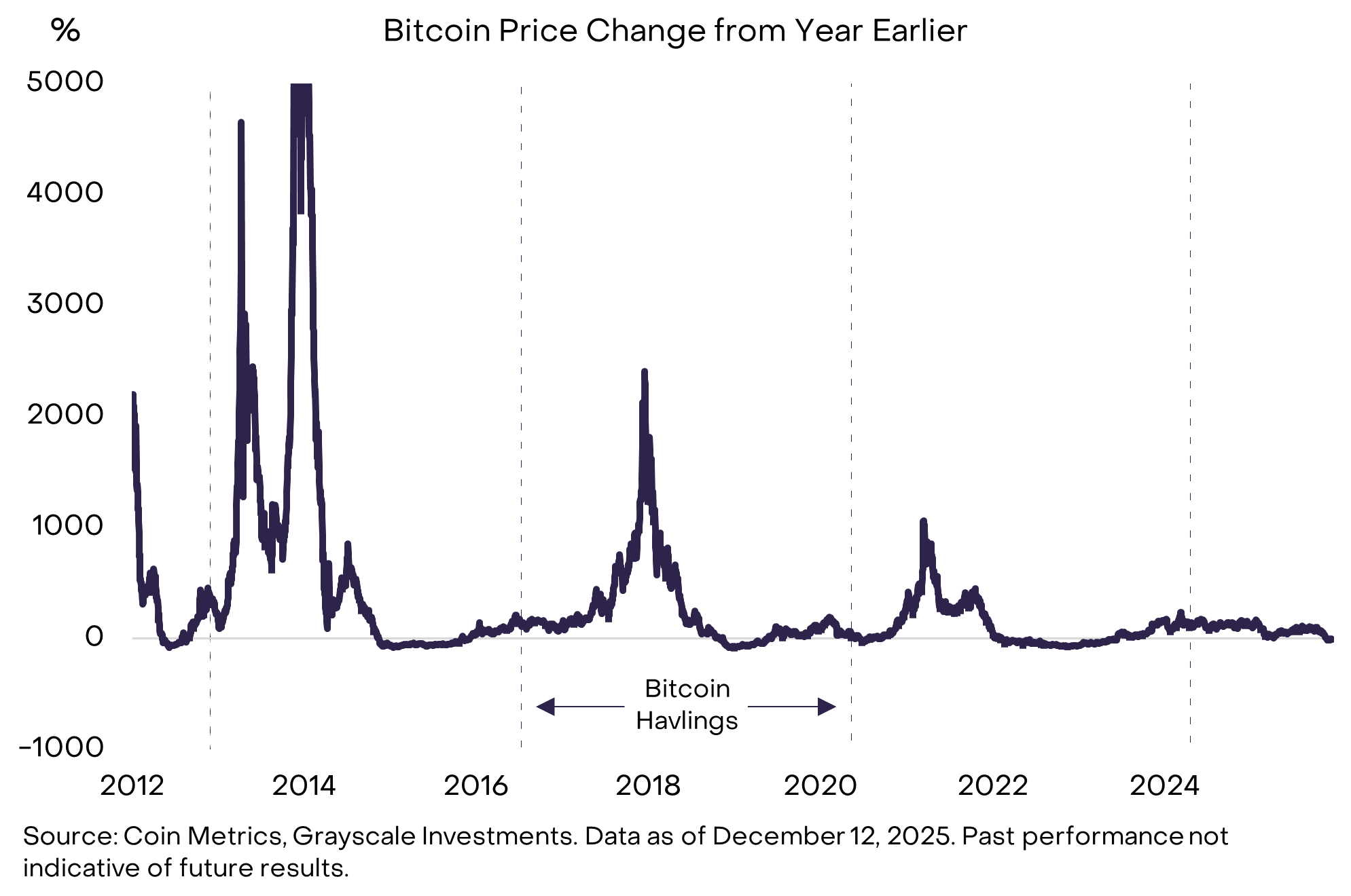 在加密货币发展的历程中,代币估值经历了四次大规模的周期性回调,大约每四年一次(见图2)。在其中的三次案例中,估值的周期性峰值出现在比特币减半事件发生后1至1.5年,而比特币减半事件每四年发生一次。目前的牛市已经持续了三年以上,而最近一次比特币减半发生在2024年4月,距今已有超过1.5年。因此,部分市场参与者的传统观点认为,比特币价格可能已在2025年10月达到峰值,而2026年将成为加密货币回报充满挑战的一年。