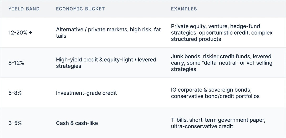 将这些投资组合上链并不会改变风险与回报之间的关系。在如今的 DeFi 前端,五种截然不同的风险等级可能都以同一张友好的广告形式呈现:「存入 USDC,赚取 X% 收益」,却几乎不会显示你承担的是现金、投资级信贷、垃圾级信贷、股票还是对冲基金的风险。