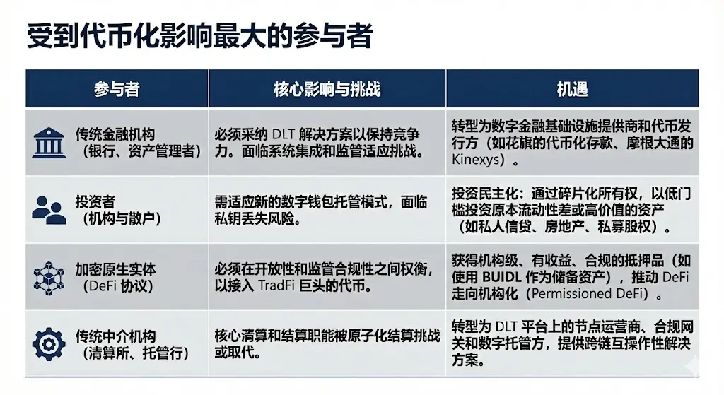 代币化带来的变革是颠覆性的,对以下几类市场参与者产生了最大的影响:
