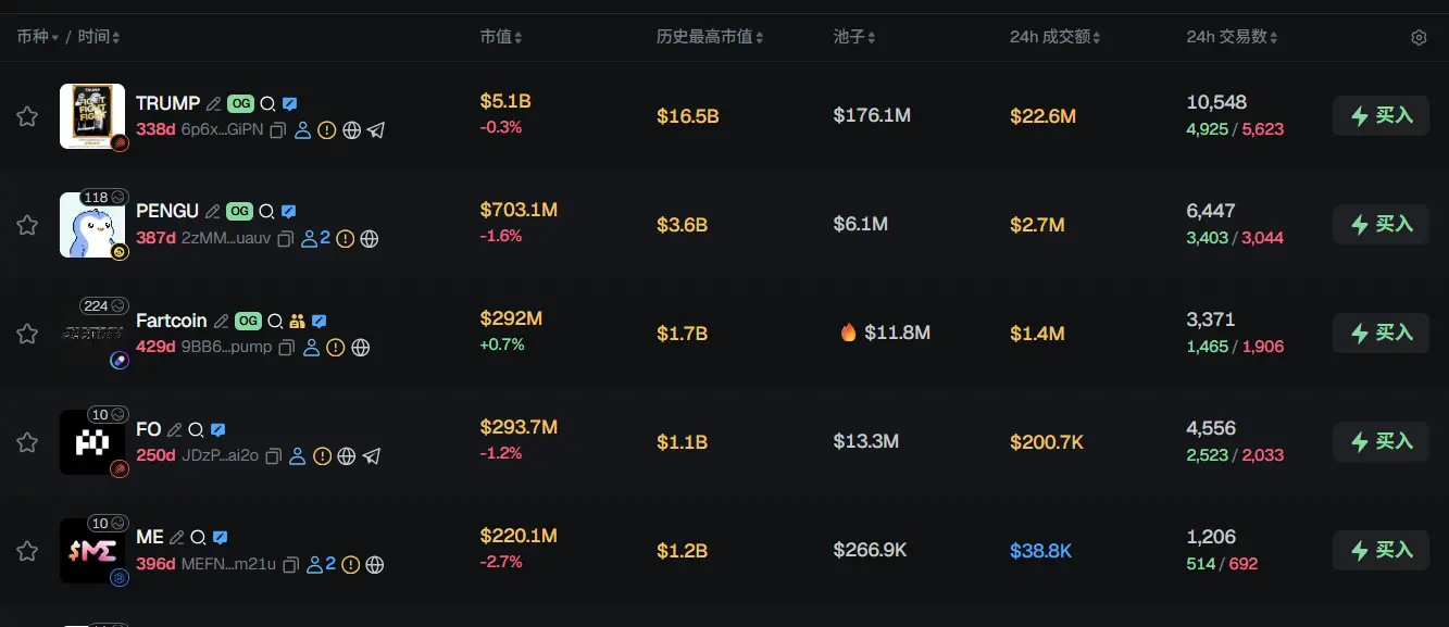 过去 24h Solana 热门代币前五依次为:TRUMP、PENGU、Fartcoin、FO、ME