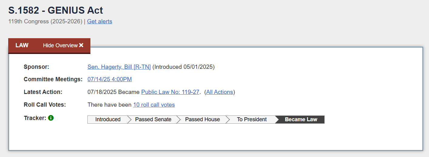 2025年6月,美国国会参议院高票通过了《2025年引导并确立美国稳定币国家创新法案》(Guiding and Establishing National Innovation for U.S. Stablecoins Act of 2025),简称GENIUS法案。这是美国首部联邦层面的稳定币监管法案,也成为国会通过的第一项重大加密立法。7月17日,众议院以308票赞成、122票反对的压倒性结果通过该法案。次日,特朗普总统签署GENIUS法案,使之正式成为法律。这一系列快速推进的立法动作,反映出两党在稳定币监管问题上已达成共识,标志着美国对数字美元稳定币的态度从观望走向积极规范。