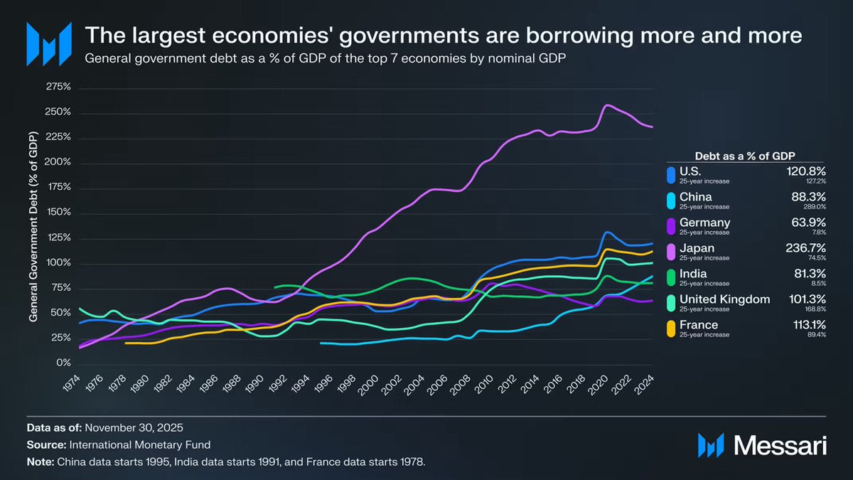 过去 50 年,全球主要经济体的政府债务占 GDP 比例,呈现出高度一致、几乎不可逆的上升趋势:
