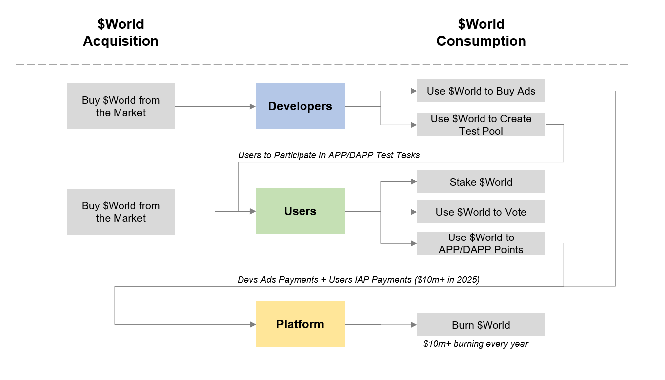 核心价值引擎 $WORLD:$WORLD 的多重效用与通缩未来