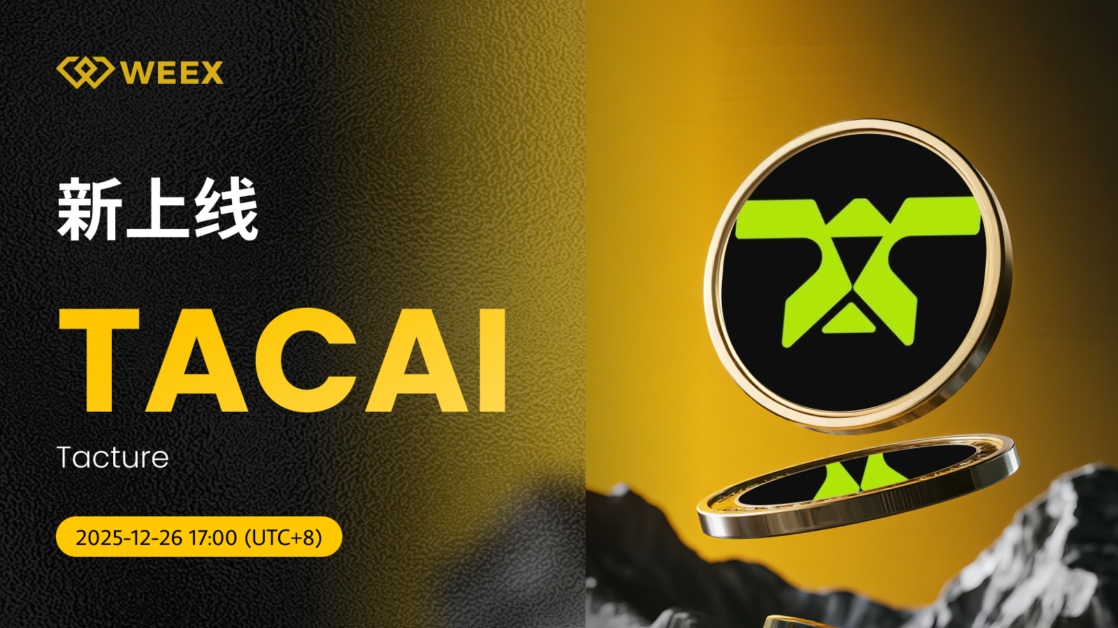 Tacture (TACAI) 现已上线WEEX! Weex 2025年12月26日 08:45 微信扫一扫分享到朋友或朋友圈 尊敬的WEEX用户:TACAI/USDT交易对正式上线WEEX。具体安排如下:充值:即将开放交易:2025年12月26日17:00(UTC 8)正式开放提现:即将开放立即交易:TACAI/USDT Tacture (TACAI) 更多信息:Tacture建立于 Arbitrum 上的 Web3 粉丝经济平台,引领明星与粉丝互动的新时代。 官网X账号交易手续费