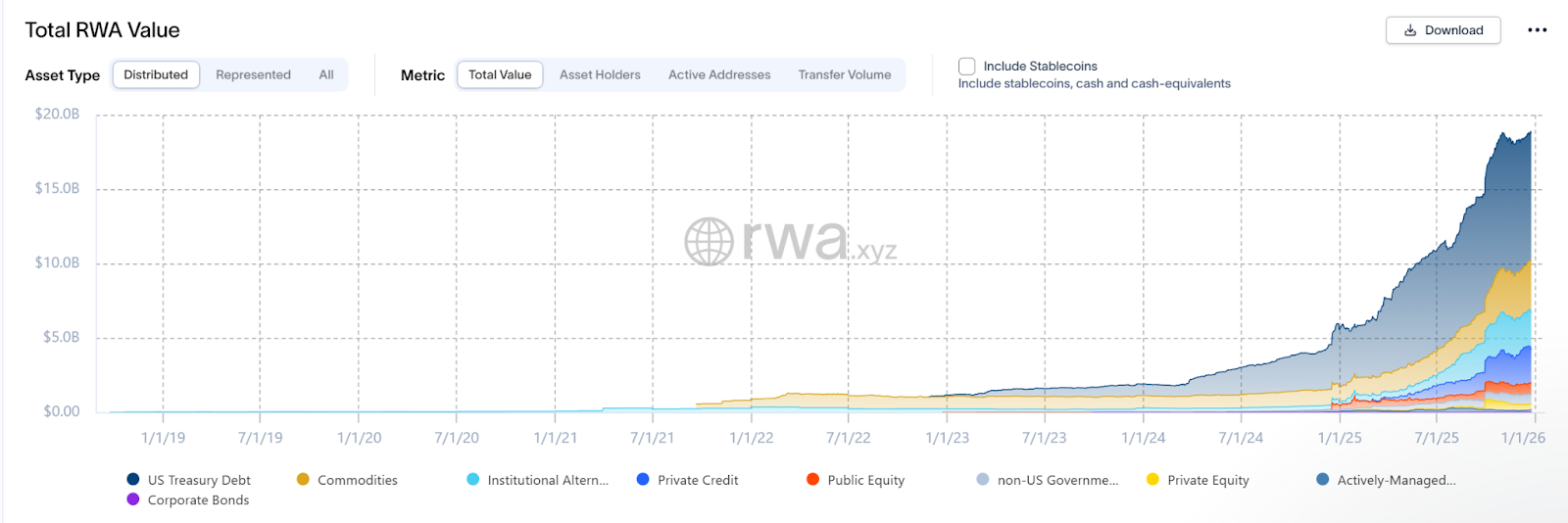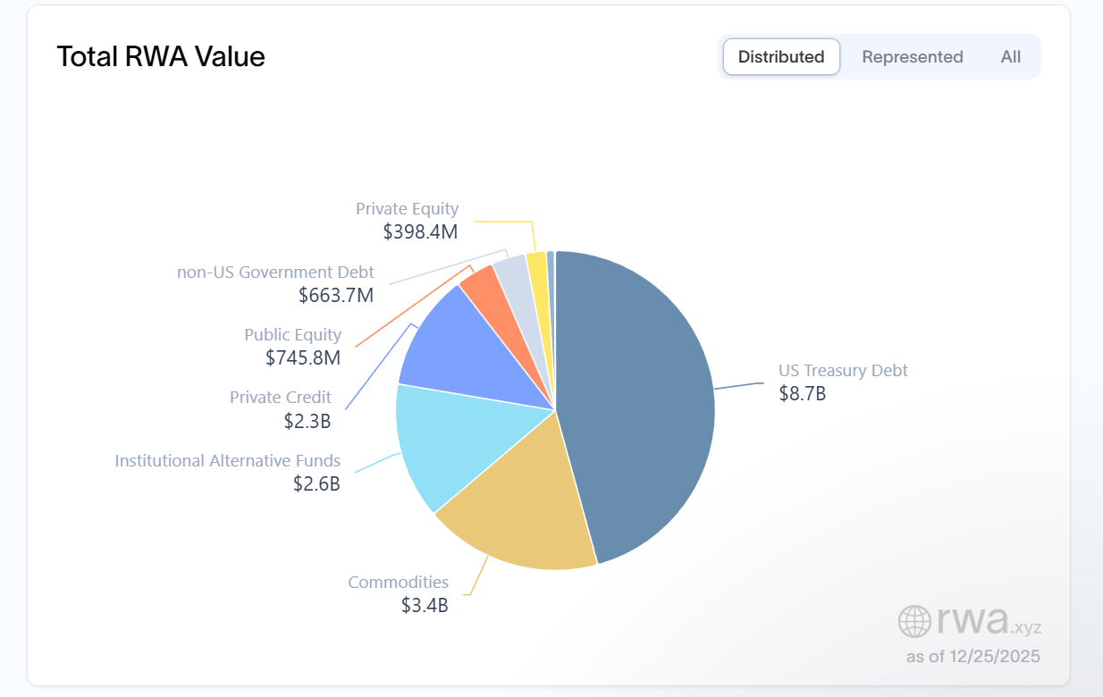 2025年见证了实物资产代币化 (RWA)从概念炒作走向规模化落地,真正成为加密资本市场的重要组成部分。随着机构寻求在链上获取传统收益,国债、房地产、股票等现实资产纷纷以代币形式搬上链。根据统计,截至2025年底,各类RWA代币的总市值已超过190亿美元。其中约一半市值来自美国国债和货币市场基金的代币化产品。贝莱德通过区块链发行了5亿美元的代币化美国国债(代码为BUIDL)。同时,老牌华尔街机构如摩根大通、高盛等开发的RWA基础设施从试验进入生产,JPM的Onyx和高盛的GS DAP平台开始承载实际交易,将企业贷款、应收账款等资产上链处理。