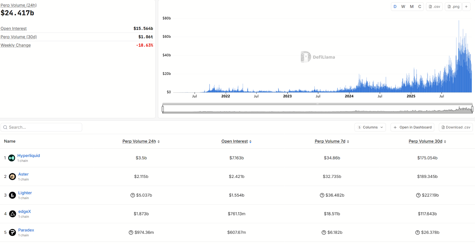 永续合约去中心化交易所(Perp DEX)成为衍生品市场不可忽视的力量。Hyperliquid、Aster等领先的Perp DEX在2025年交易量迭创新高,加上交易挖矿和手续费返还等激励,吸引了众多流动性提供者和做市商参与。一系列数据显示,2025年全年去中心化衍生品总交易量达到了历史峰值,DeFi衍生品已从早期的小众尝试升级为具备系统重要性的市场组成部分。