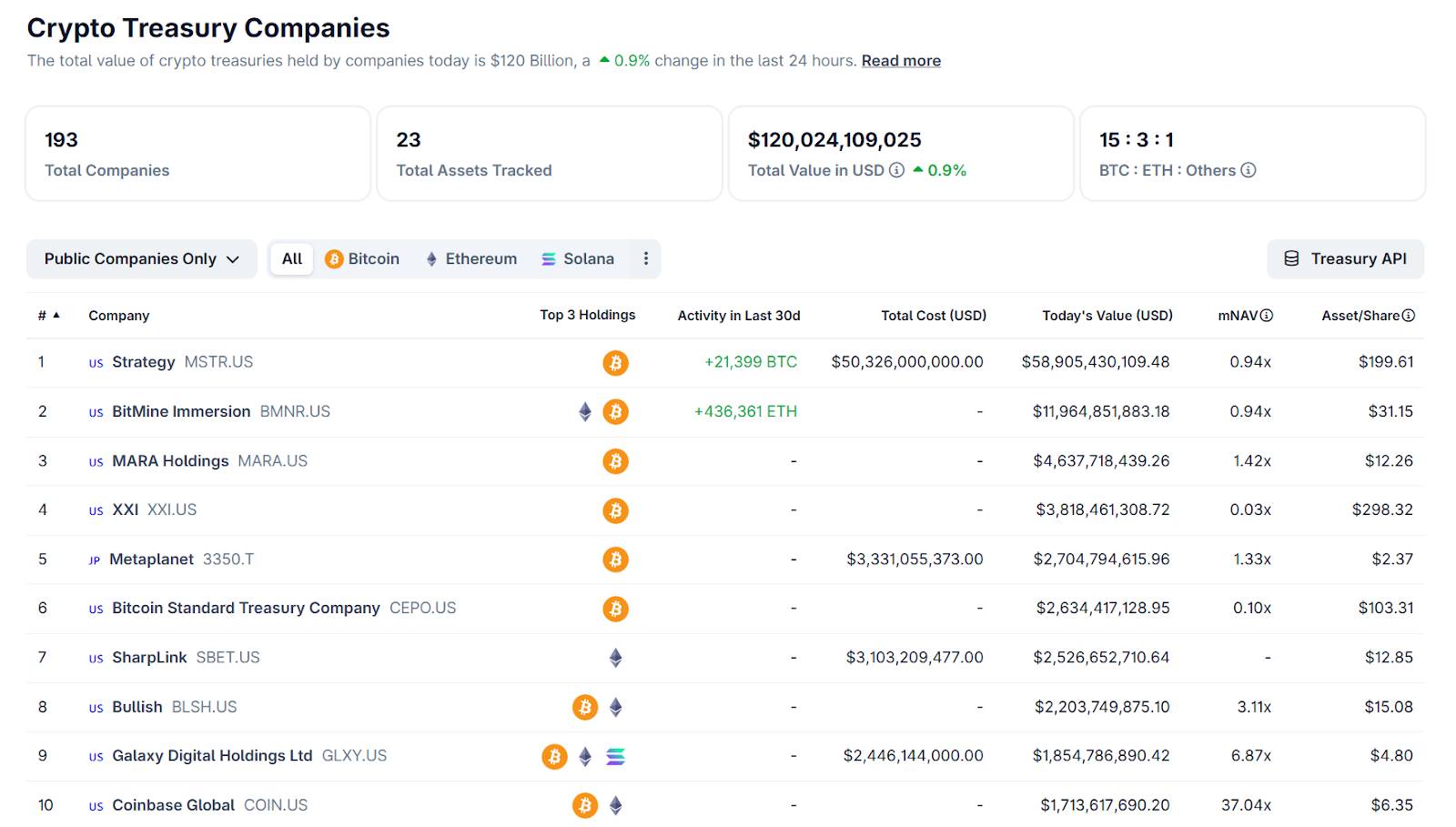 受益于会计准则改革(允许加密资产按公允价值计量)和风险投资偏好的转变,大批中小市值上市公司宣布效仿MicroStrategy,将部分现金储备投入比特币、以太坊等加密资产,摇身变为“数字资产财库公司 (DAT)”。根据CoinGecko数据,目前共有193家上市企业发布了加密财库计划,筹资超过1,200亿美元用于购买BTC、ETH、SOL、BNB等加密资产加密资产。许多传统行业公司试图通过这一举动分享加密牛市红利,其股价也一度因持币消息而暴涨数倍。