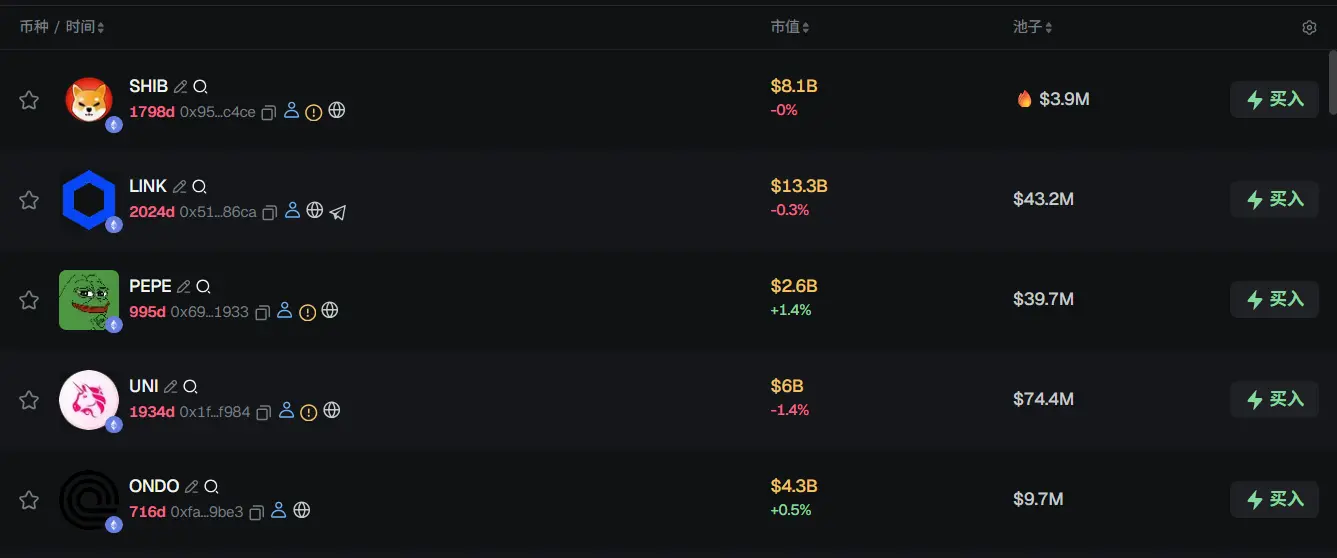 过去 24h ETH 热门代币前五依次为:SHIB、LINK、PEPE、UNI、ONDO