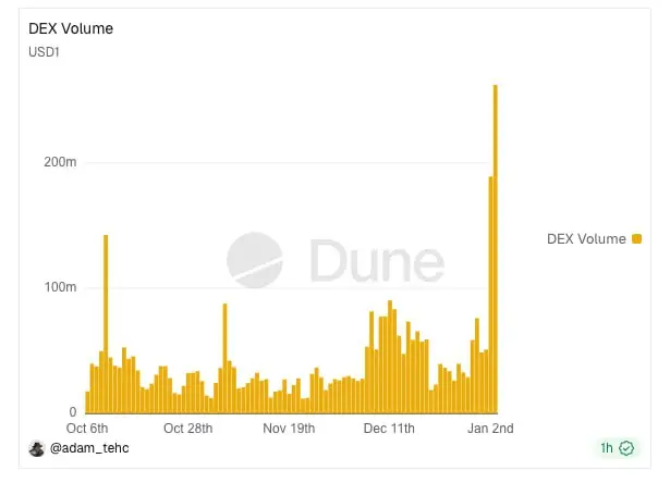 Raydium:Solana 上 USD1 交易量在过去 24 小时内突破 2.6 亿美元