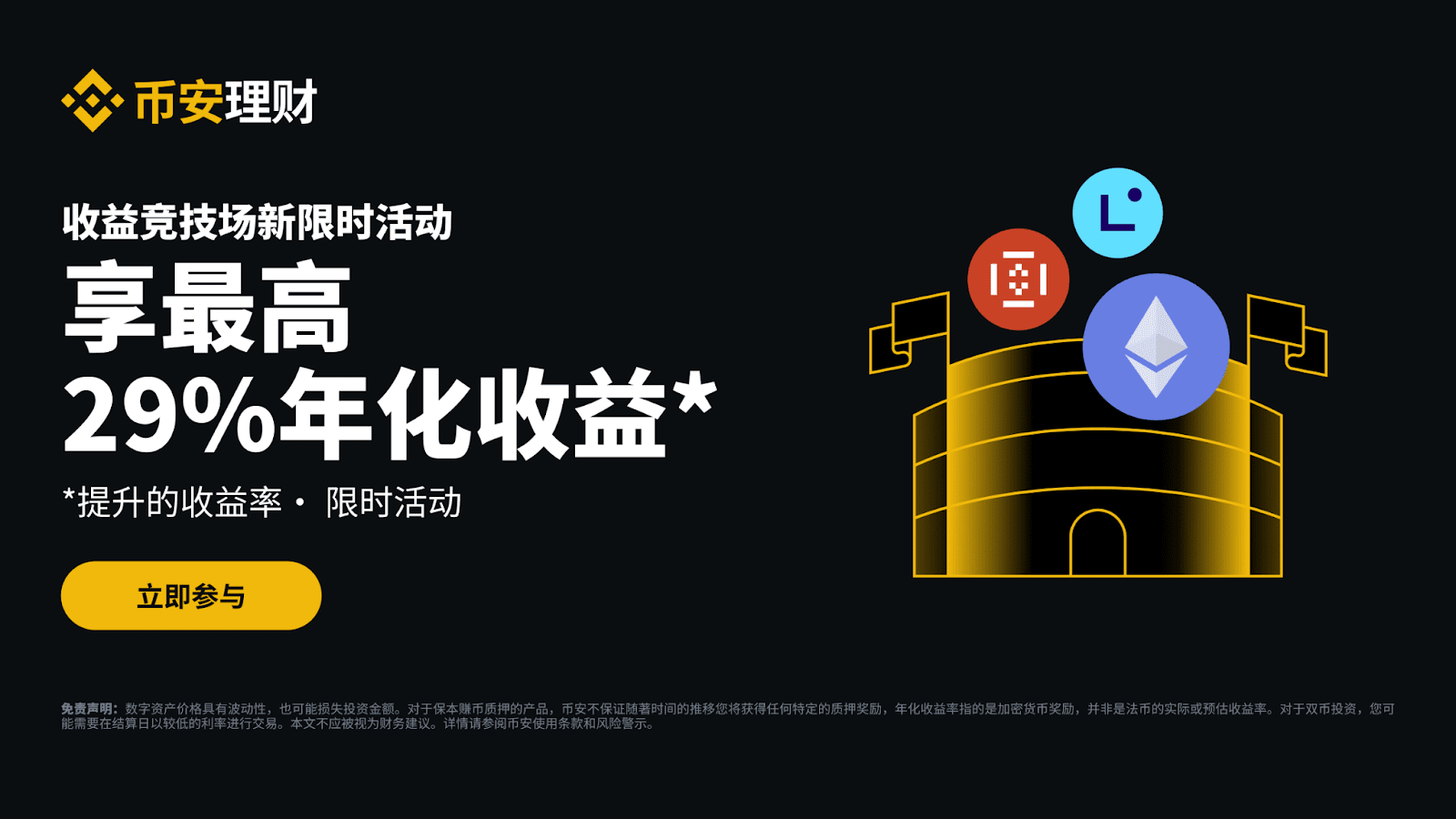 币安理财竞技场每周为您推出一系列新限时活动。请持续关注“币安理财竞技场”更多活动,通过币安保本赚币、ETH质押、SOL质押、双币投资等获得收益。