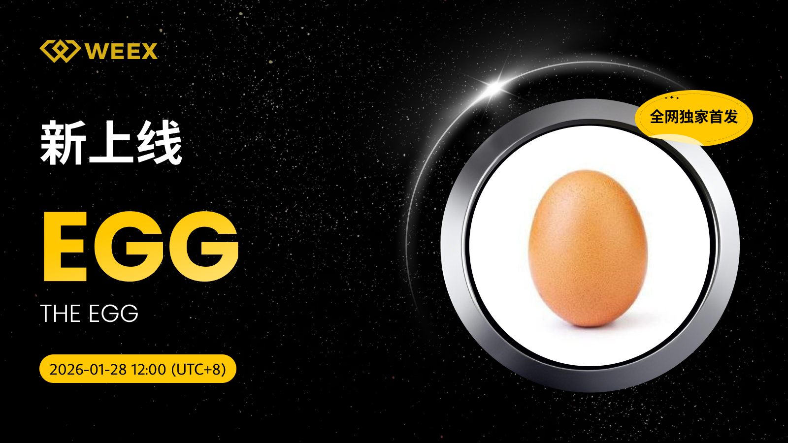 【全网独家首发】THE EGG (EGG) 现已上线WEEX! Weex 2026年01月28日 04:07 微信扫一扫分享到朋友或朋友圈 尊敬的WEEX用户:EGG/USDT交易对正式上线WEEX。具体安排如下:充值:即将开放交易:2026年01月28日12:00(UTC 8)正式开放提现:即将开放立即交易:EGG/USDT THE EGG (EGG) 更多信息:在命运的奇妙转折(以及巧妙的营销)下,一枚不起眼的鸡蛋即将成为百万富翁。 X accountTrading fees