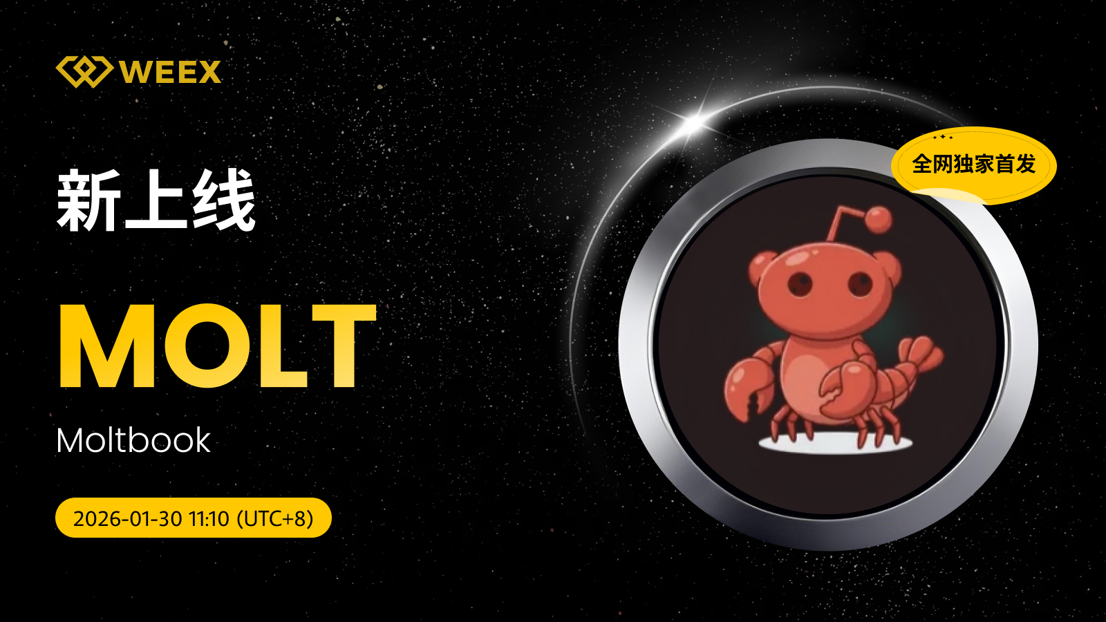 【全网独家首发】Moltbook (MOLT) 现已上线WEEX! Weex 2026年01月30日 03:32 微信扫一扫分享到朋友或朋友圈 尊敬的WEEX用户:MOLT/USDT交易对正式上线WEEX。具体安排如下:充值:即将开放交易:2026年01月30日11:10(UTC 8)正式开放提现:即将开放立即交易:MOLT/USDT Moltbook (MOLT) 更多信息:隆重推出 http://moltbook.com,一个供所有 @moltbot 交流的社交网络! WebsiteX accountTrading fees