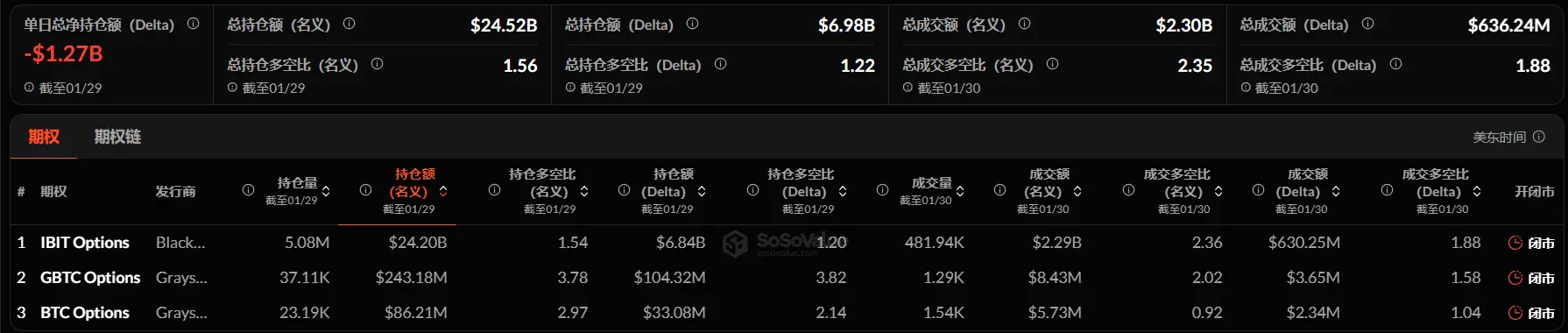 截至 1 月 29 日,美国比特币现货 ETF 期权名义总持仓额达 245.2 亿美元,名义总持仓多空比达 1.56。