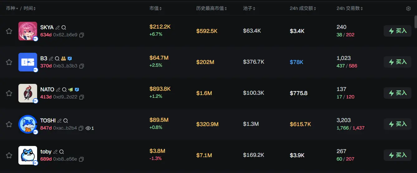 过去 24h Base 热门代币前五依次为:SKYA、B3、NATO、TOSHI、toby