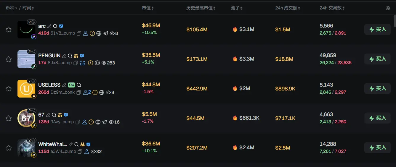 过去 24h Solana 热门代币前五依次为:arc、PENGUIN、USELESS、67、WhiteWhale