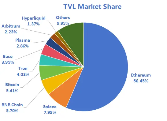 按公链进行划分,其中TVL最高的三条公链分别是Ethereum链,占比56.45%;Solana链,占比7.95%;BNB Chain,占比5.7%。