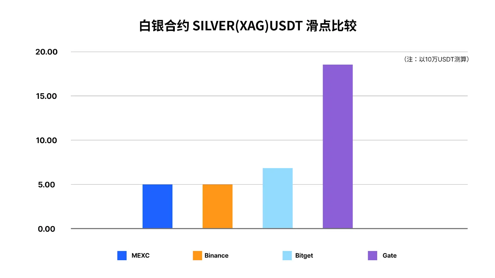 在滑点测试中,以 10 万 USDT 订单规模为例,MEXC 与 Binance 的滑点损耗最低,约 5 USDT;Bitget 约 7 USDT,Gate 约 18 USDT。这表明在白银这类更高波动标的上,MEXC 的成交质量更稳定,隐性交易成本更低。