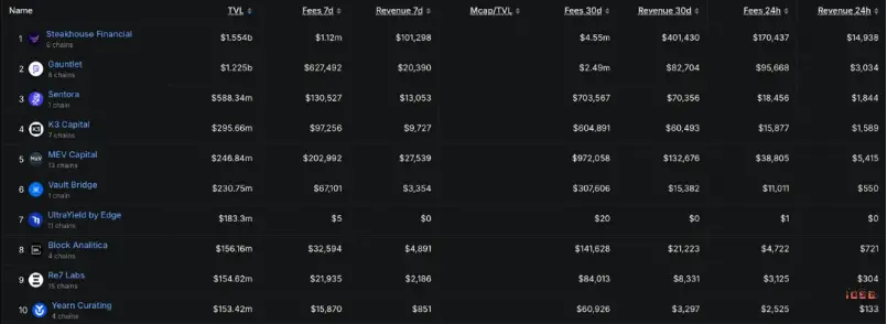 AUM 高度集中,头部的Steakhouse Financial ≈ $1.55B,Gauntlet ≈ $1.23B,前两名合计接近 50% 市场份额,是一个非常典型的幂律结构。