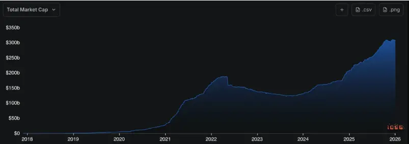 对于这类 Curator 的问题是需要找到高收益同时容量大的策略——几乎所有 DeFi 策略都存在明确容量上限。以当前主流的 looping / basis 策略为例,市场规模已接近 $20B(约占 DeFi TVL 的 10%),而六个月前仅约 $5B。容量快速被填满后,边际收益显著下降,参数容错空间急剧收缩。