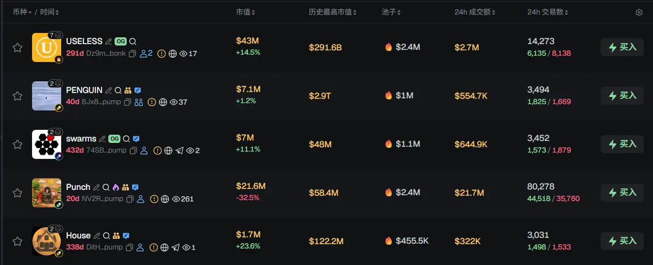 过去 24h Solana 热门代币前五依次为:USELESS、PENGUIN、swarms、Punch、House