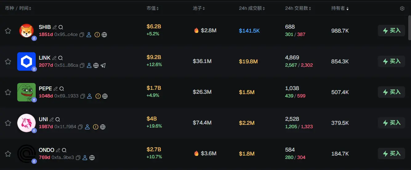 过去 24h ETH 热门代币前五依次为:SHIB、LINK、PEPE、UNI、ONDO