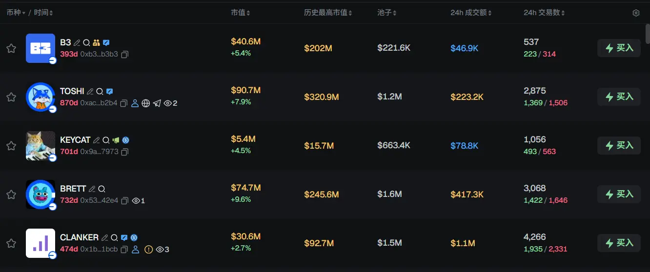 过去 24h Base 热门代币前五依次为:B3、TOSHI、KEYCAT、BRETT、CLANKER