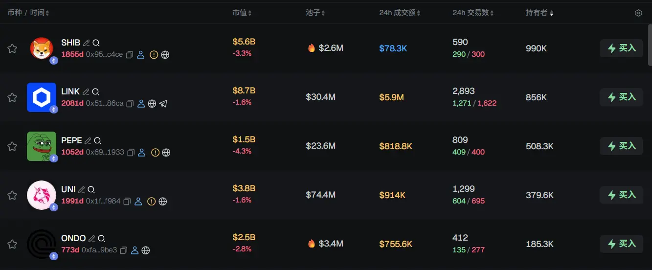 过去 24h ETH 热门代币前五依次为:SHIB、LINK、PEPE、UNI、ONDO