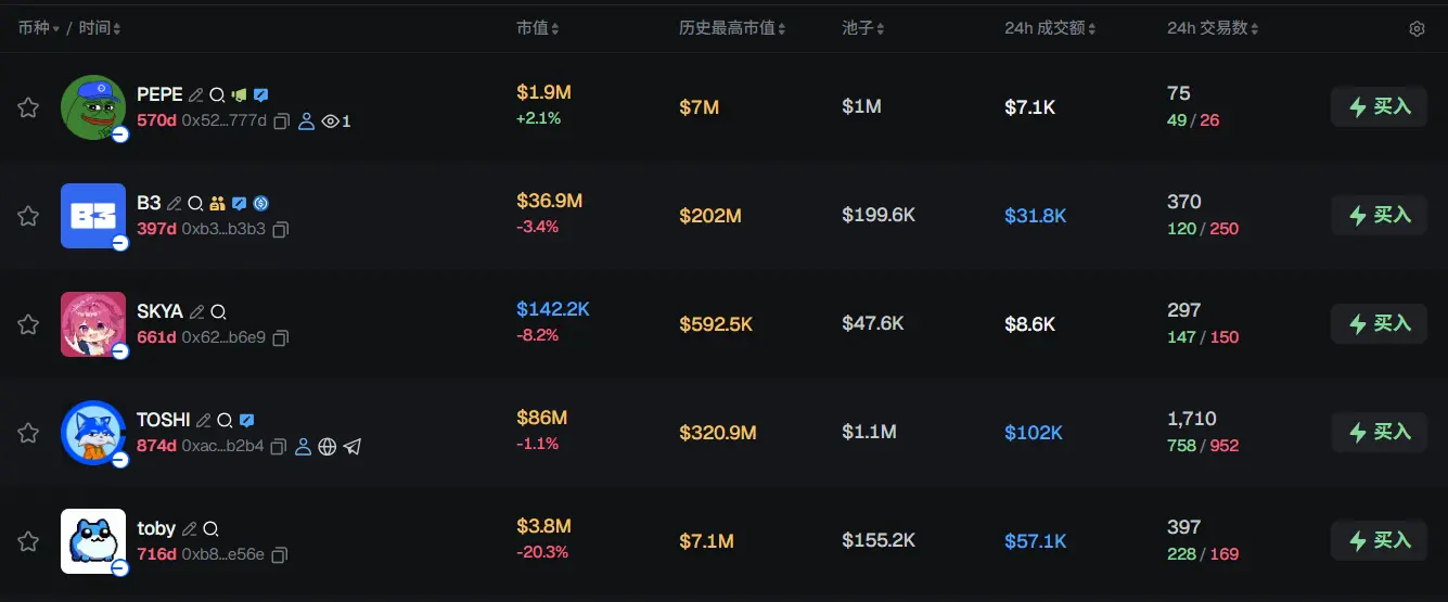 过去 24h Base 热门代币前五依次为:PEPE、B3、SKYA、TOSHI、toby