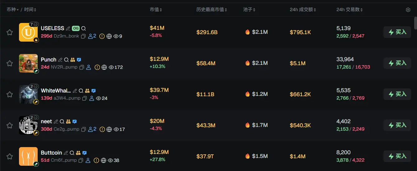 过去 24h Solana 热门代币前五依次为:USELESS、Punch、WhiteWhale、neet、Buttcoin