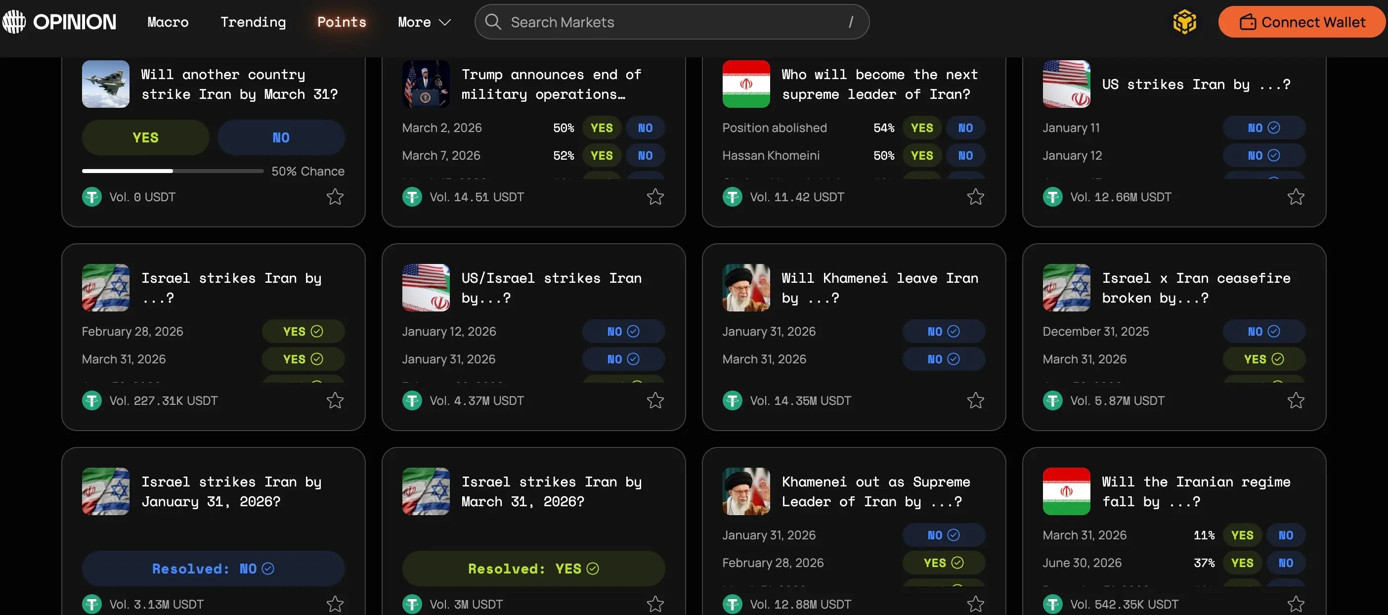 虽然相关合约数量和整体交易规模仍低于 Polymarket ,但 Opinion 上呈现出更清晰的风险分层结构:军事行动、停火状态、领导人去留与政权走向被拆解为多个独立变量,并行定价。战争因此不再只是“是否发生”的单点问题,而是一条可被分段、量化并持续修正的风险路径。预测市场在此成为对主权风险与制度稳定性的实时计量工具。
