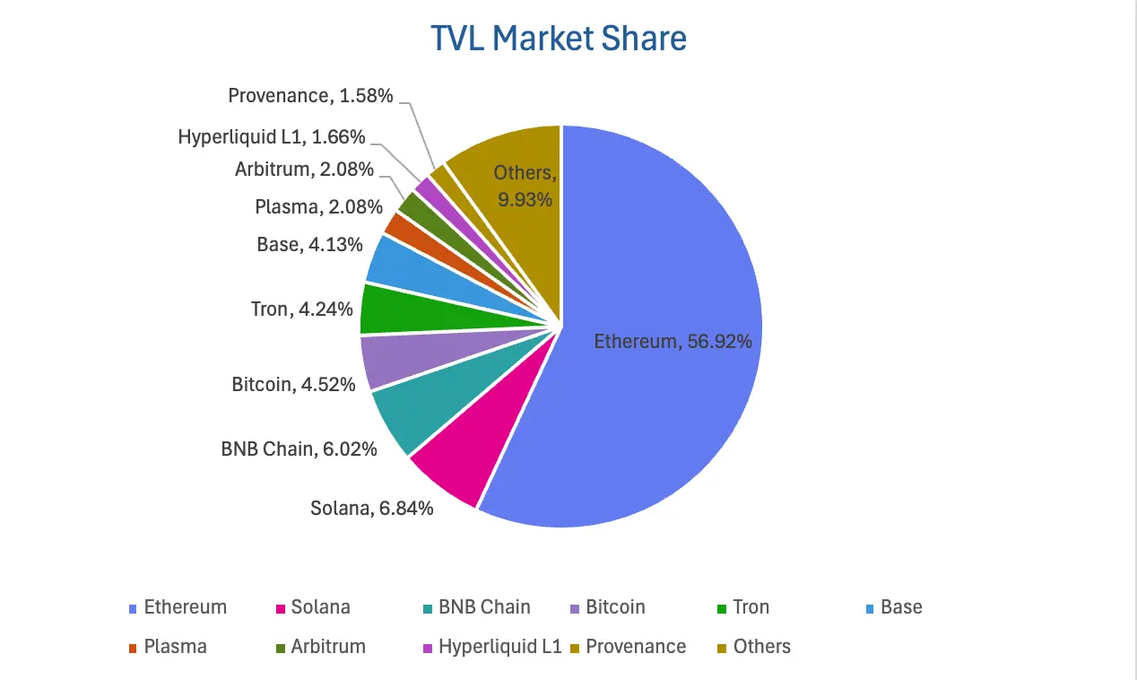 按公链进行划分,其中TVL最高的三条公链分别是Ethereum链,占比56.92%;Solana链,占比6.84%;BNB Chain,占比6.02%。
