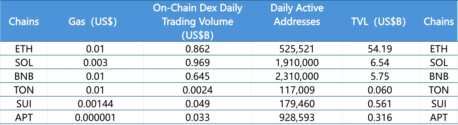 主要从日交易量、日活跃地址、交易费用分析目前主要Layer1含ETH、SOL、BNB、TON、SUI以及APTOS的相关数据。