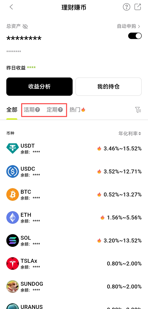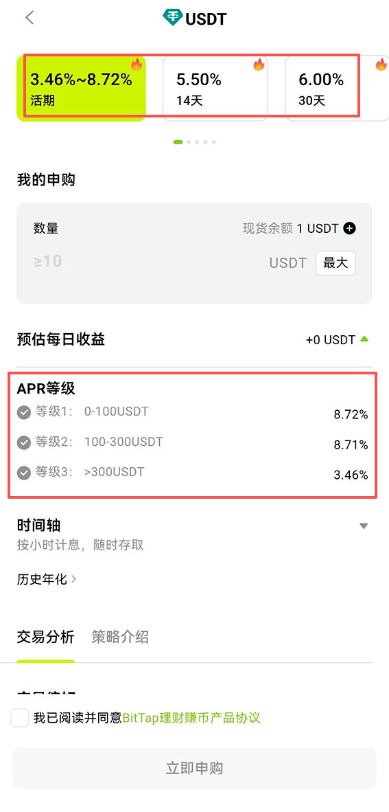 选择你想要申购的币种和具体产品,点击进入查看详情,包括收益率、起息和赎回规则。