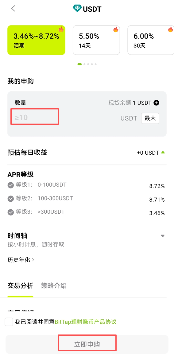输入你想要投入的金额,确认后点击“立即申购”,即可成功参与,等待收益到账!