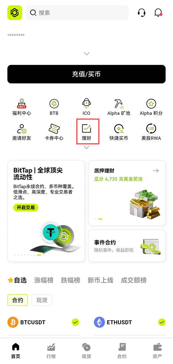 打开BitTap,在首页找到并点击“理财”入口,即可查看所有理财产品。