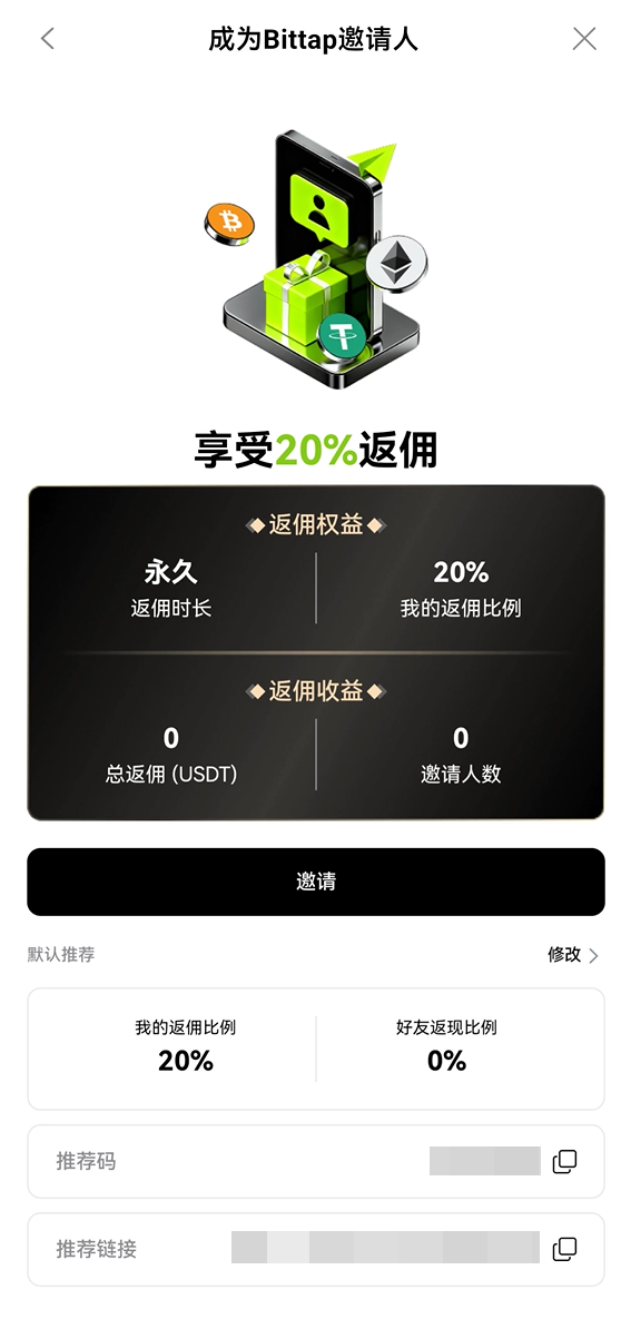 BitTap邀请返佣 BitTap 2026年03月16日 09:46 微信扫一扫分享到朋友或朋友圈 第一步:获取专属邀请链接 进入“邀请好友”页面,这里会有您的专属推荐码和推荐链接。点击即可一键复制。 第二步:邀请好友注册 将链接或二维码分享给朋友。好友通过您的链接成功注册,即建立邀请关系。 第三步:获得交易返佣 当您的好友在平台进行交易时,您就可以从他们的手续费中获得一定比例的返佣。 邀请越多,收益越多。具体返佣比例请以页面规则为准。马上分享,开始赚取你的额外收益吧!