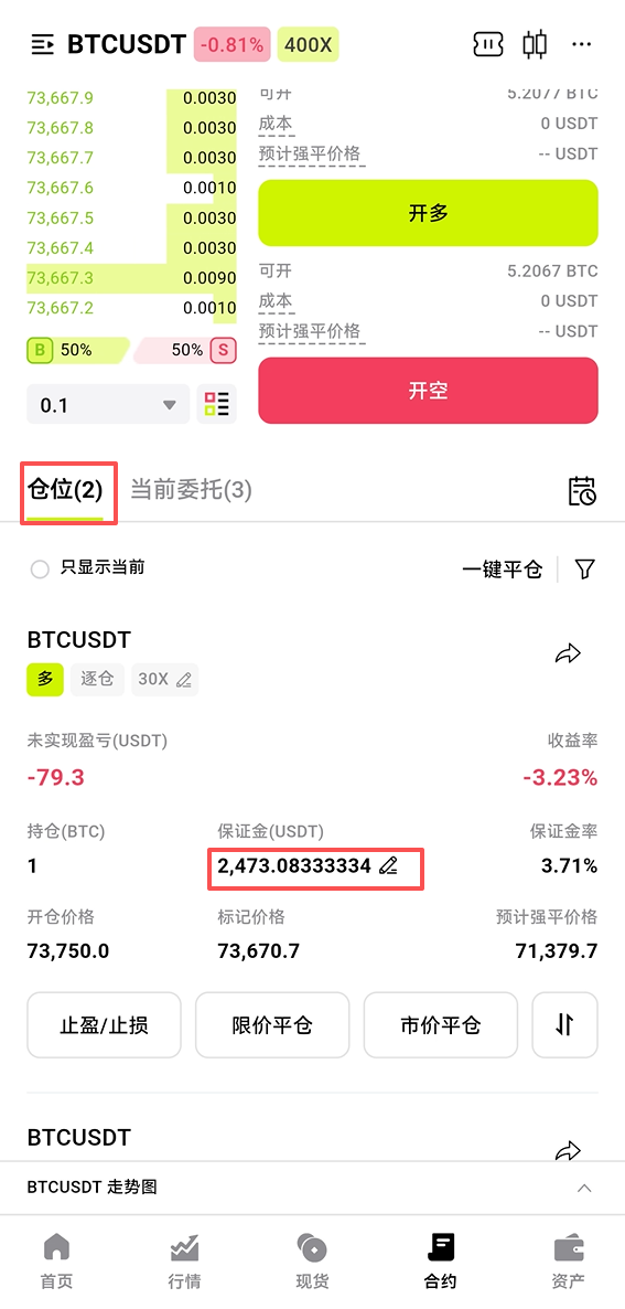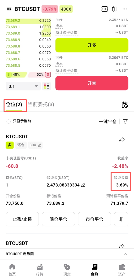 方法二:设置止损。提前设好止损价格,价格跌到位置自动平仓,避免强平风险。