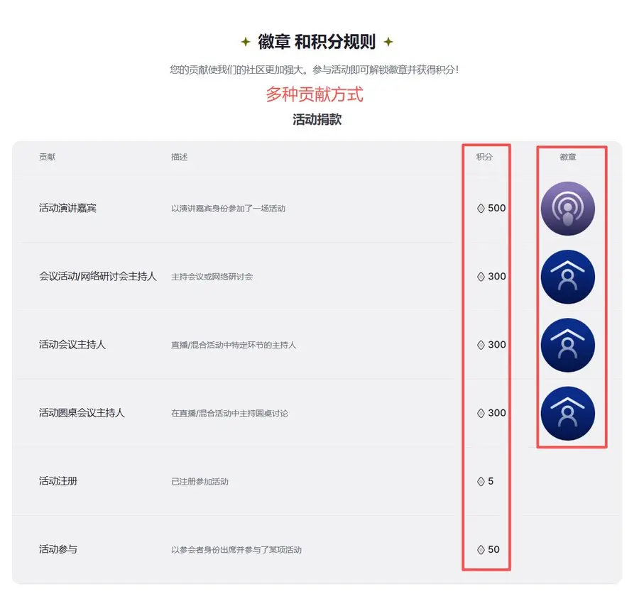 贡献分类:活动贡献、内容贡献、论坛贡献、社区活动、其他贡献共计五类,不同的贡献除了积分奖励还有额外的徽章奖励。