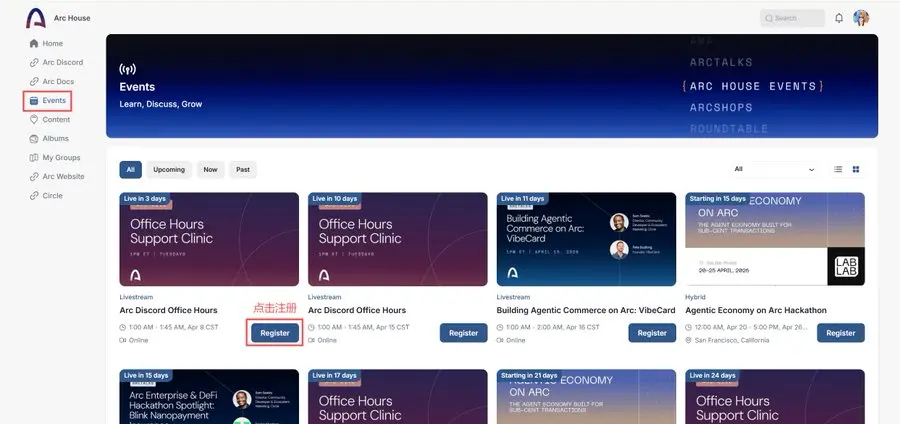 第五步:点击左侧「Events」页面,把所有能登记的活动都登记上。