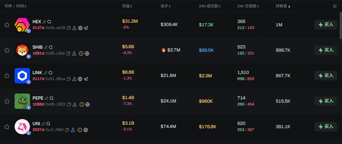 过去 24h ETH 热门代币前五依次为:HEX、SHIB、LINK、PEPE、UNI