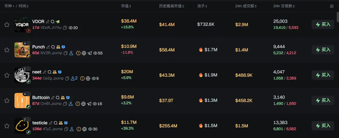 过去 24h Solana 热门代币前五依次为:VDOR、Punch、neet、Buttcoin、testicle