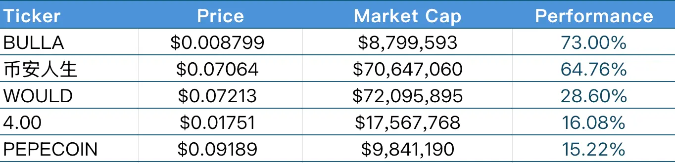 日活跃地址与TVL:日活跃地址反应了公链的生态参与度和用户粘性,TVL反应了用户对平台的信任程度。日活跃地址方面,BNB Chain(242万个)较上周几乎持平;Aptos(51.4万个)、Ethereum(45.5万个)和Ton(10.4万个)分别下降52.09%、10.54%和6.45%;Sui(28.4万个,14.38%)和Solana(403.6万个, 8.34%)有所上升。TVL方面,Solana($5.57B,-11.88%)和Aptos($0.269B,-8.19%)有所下降,其余链变化不大,分别为Sui($0.566B, 0.89%)、Ethereum($54.47B,3.17%)、BNB Chain($5.38B,2.75%)、和Ton($0.055B,-1.38%)。