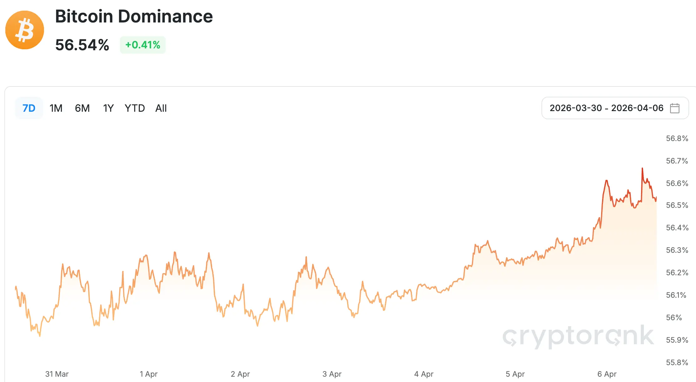 数据来源:Bitcoin dominance from cryptorank, https://cryptorank.io/charts/btc-dominance