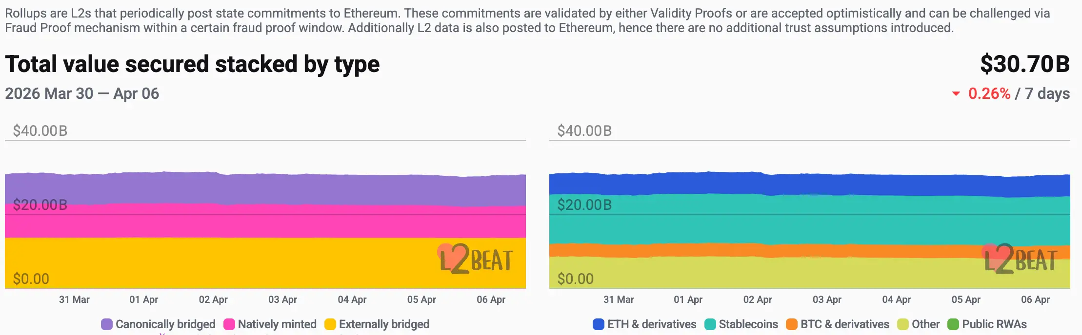 据L2Beat数据显示,本周以太坊Layer2总TVL为$307.0亿,较上周$309.7亿,整体跌幅为0.87%。