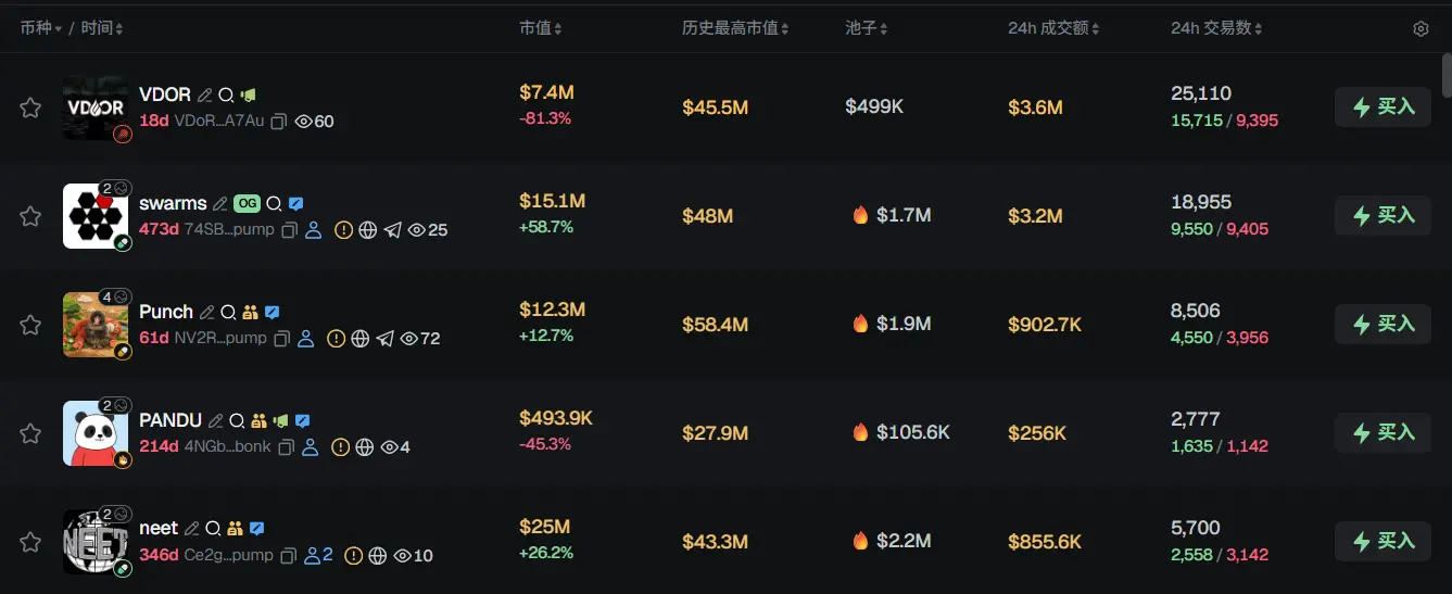 过去 24h Solana 热门代币前五依次为:VDOR、swarms、Punch、PANDU、neet