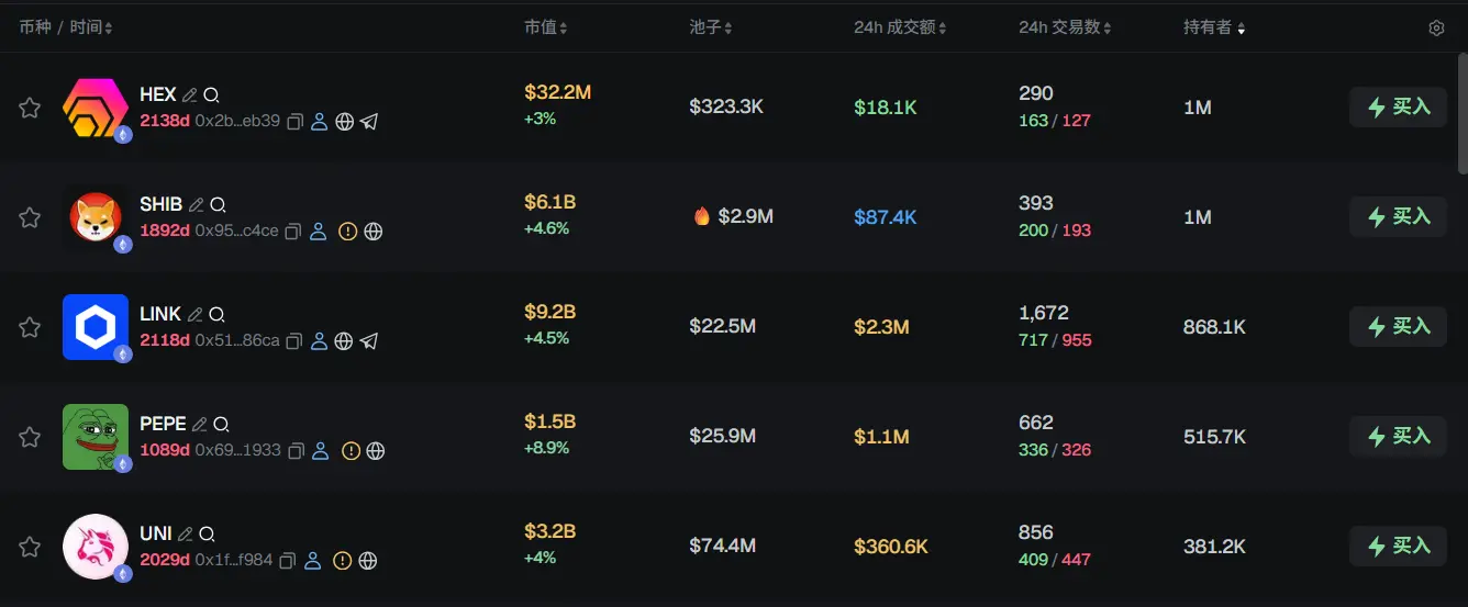 过去 24h ETH 热门代币前五依次为:HEX、SHIB、LINK、PEPE、UNI