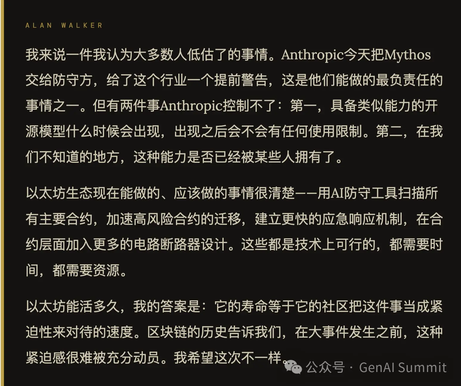 "以太坊能活多久,等于它的社区把这件事当成紧迫性来对待的速度。技术上的答案,Mythos 已经给了。人的答案,还没有。" 他们握了握手,朝不同方向走了。我站在走廊里,翻着手机上密密麻麻的笔记。 以太坊:680 亿美元,代码全公开,合约不可修改,28% 的质押 ETH 集中在一个协议,治理响应需要数天。 Mythos:分析一个合约的时间,可能比我翻完这页笔记还短。 我不知道第一次真正意义上的、AI 驱动的、以太坊规模级别的安全事件,会什么时候发生。我只知道 Alan 那句话是对的:区块链历史上,"应该早点做什么"这种对话,发生过太多次了,每次都是在事情发生之后。 希望这次不一样。